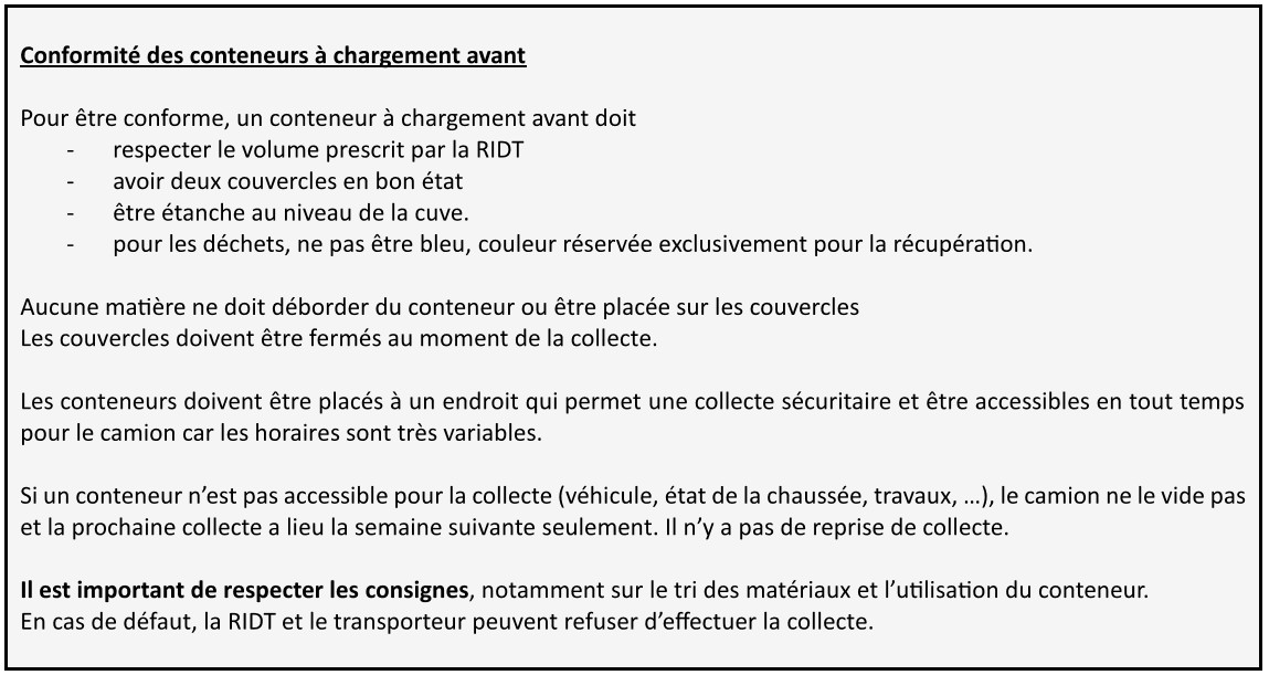 L’utilisation de contenants de collecte, autorisés par la RIDT et conformes, est obligatoire.