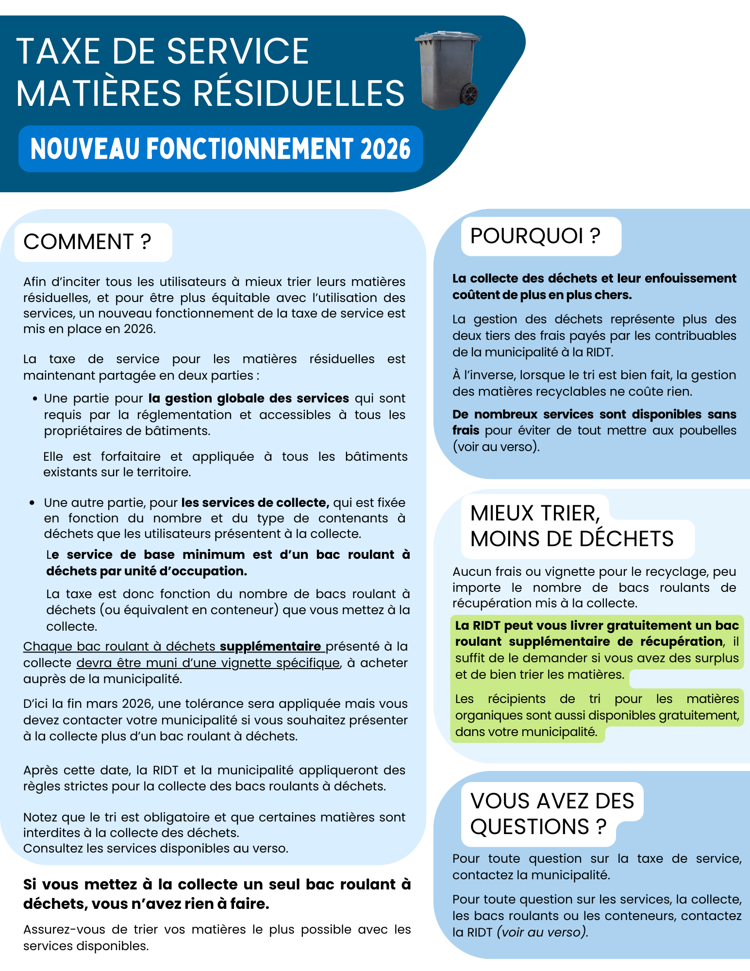 La réglementation municipale impose à tous les utilisateurs des services de la RIDT de participer activement au tri des matières pour éviter au maximum leur enfouissement.