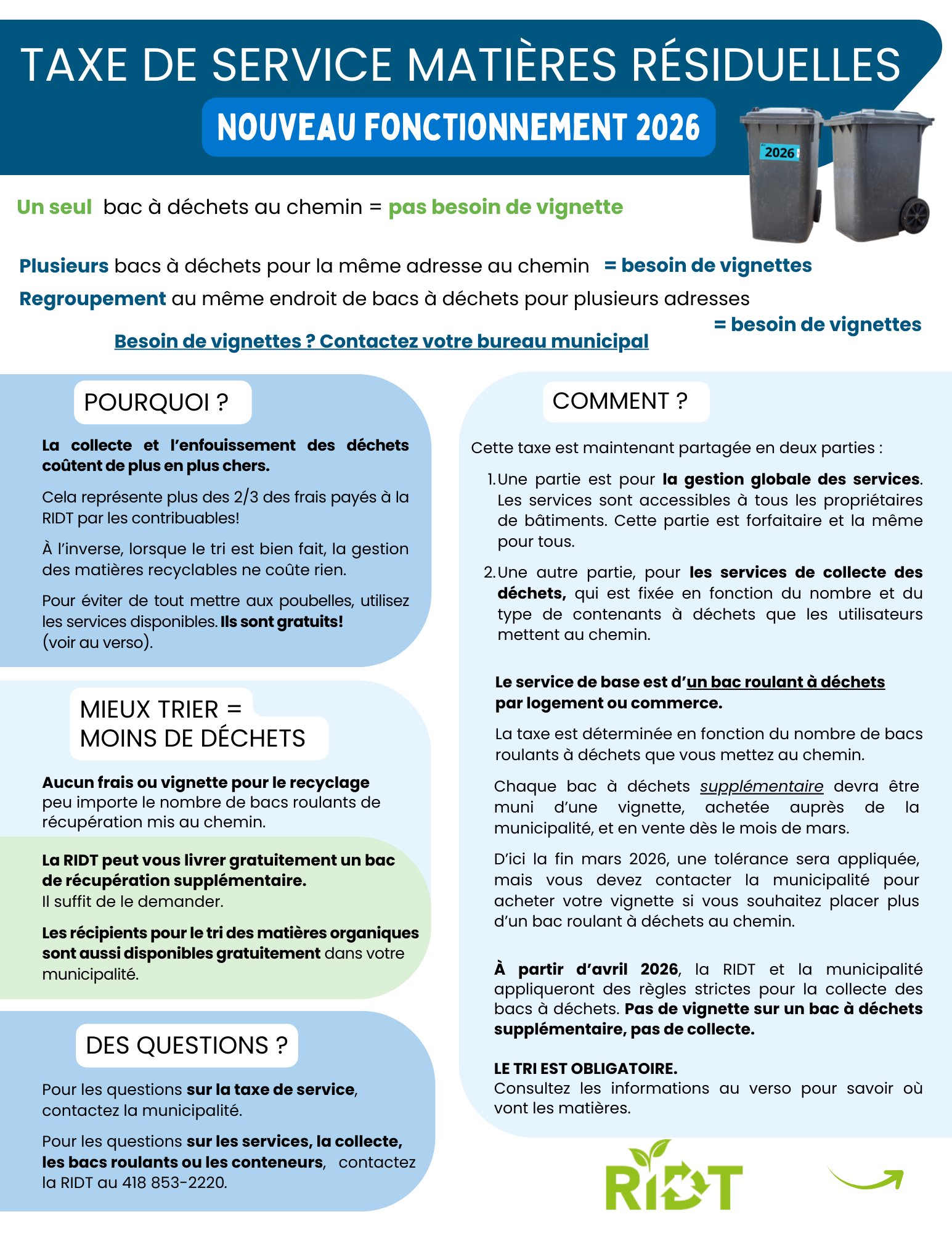 Si les matières ne sont pas triées, les contenants ne sont pas conformes ou mal utilisés, ils ne seront pas vidés par le service de collecte de la RIDT.